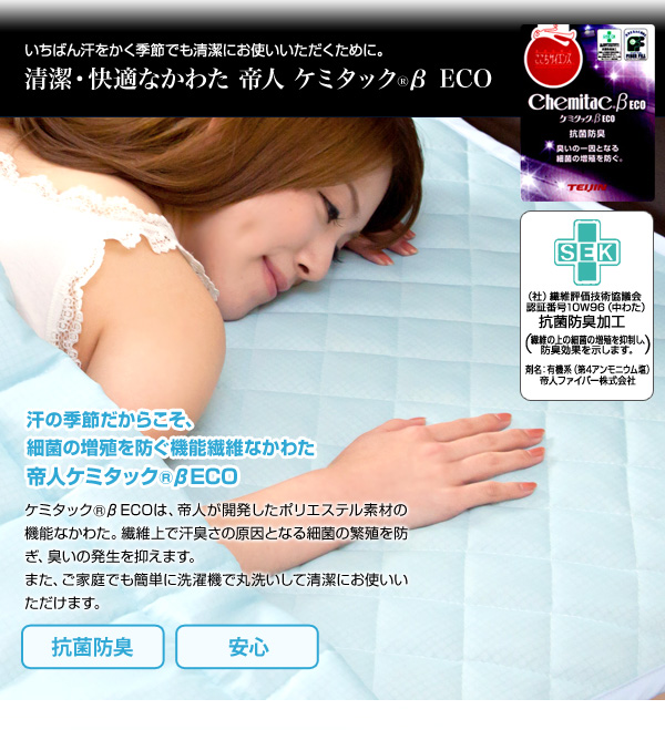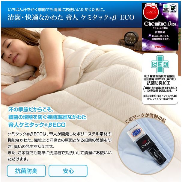 清潔・快適なかわた 、汗の季節だからこそ、細菌の増殖を防ぐ機能繊維 また、ご家庭でも簡単に洗濯機で丸洗いして清潔にお使いいただけます。