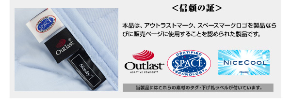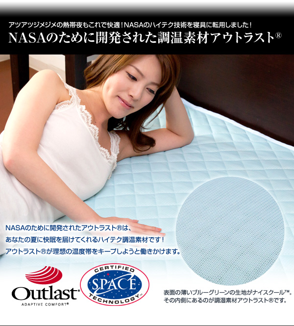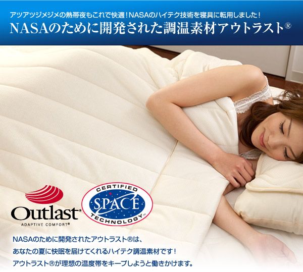 NASAのハイテク技術を寝具に転用。アウトラストが理想の温度帯をキープしようと働きかけ湿気の多いジメジメした夜から真夏の熱帯夜まで快眠を届けてくれるハイテク調温素材を使用しています。