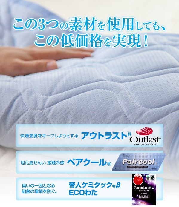 この3つの素材を使用し 調温・接触冷感・清潔・快適を実現した快適快眠ひんやりアウトラストです。
