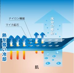 強化されたひんやり感、接触冷感素材のナイロン繊維に熱伝導性や水和性が極めて高いマイカ鉱石(雲母)を蒸着。より一層のひんやり感を強化、実現しました。